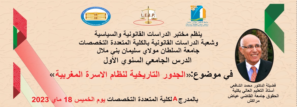 بمبادرة من مختبر الدراسات القانونية والسياسية التابع لجامعة السلطان مولاي سليمان ببني ملال، ستعرف الكلية المتعددة التخصصات ببني ملال لقاءا علميا متميزا تفاعلا مع النقاش العلمي والمجتمعي المدني حول مدونة الأسرة،.