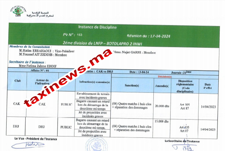 أصدرت لجنة الأخلاقيات بالعصبة الوطنية لكرة القدم الاحترافية، قرارات تأديبية حول الأحداث المؤسفة التي رافقت مباراة الجولة 21 من البطولة الوطنية الاحترافية للقسم الثاني التي جمعت يوم السبت 13 أبريل 2024 بين شباب أطلس خنيفرة وضيفه الدفاع الحسني الجديدي.