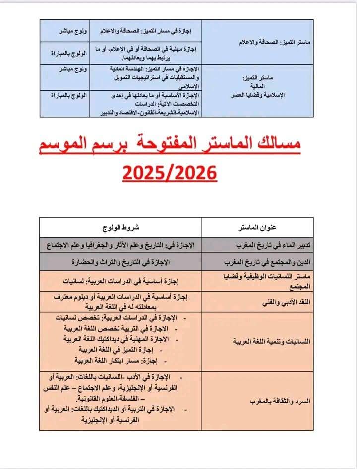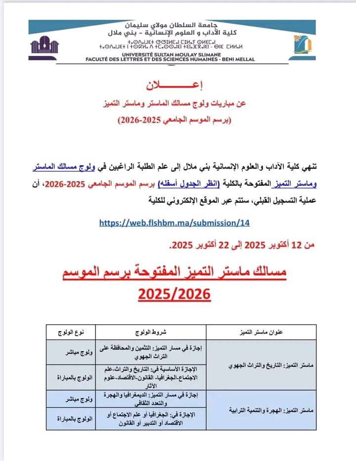 أعلنت كلية الآداب والعلوم الإنسانية بني ملال إلى علم الطلبة الراغبين في ولوج مسالك الماستر وماستر التميز المفتوحة بالكلية، والمبينة في الجدول أسفله برسم الموسم الجامعي 2025-2026، أن عملية التسجيل القبلي، ستتم عبر الموقع الإلكتروني للكلية