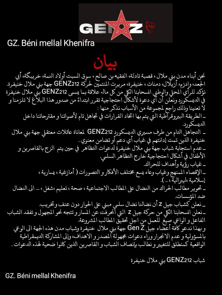 أعلن شباب من مدن بني ملال، قصبة تادلة، الفقيه بن صالح، سوق السبت أولاد النمة، خريبكة، أبي الجعد، وادي زم، أزيلال، دمنات، خنيفرة ومريرت، المنتمون لحركة “GENZ212″، في بيان، عن انسحابهم الكلي من كل ما له علاقة بما يسمى “GENZ212 بني ملال خنيفرة” على منصة “ديسكورد”، مؤكدين أن أي دعوة لأشكال احتجاجية مستقبلية لا تلزمهم ولا تعنيهم.