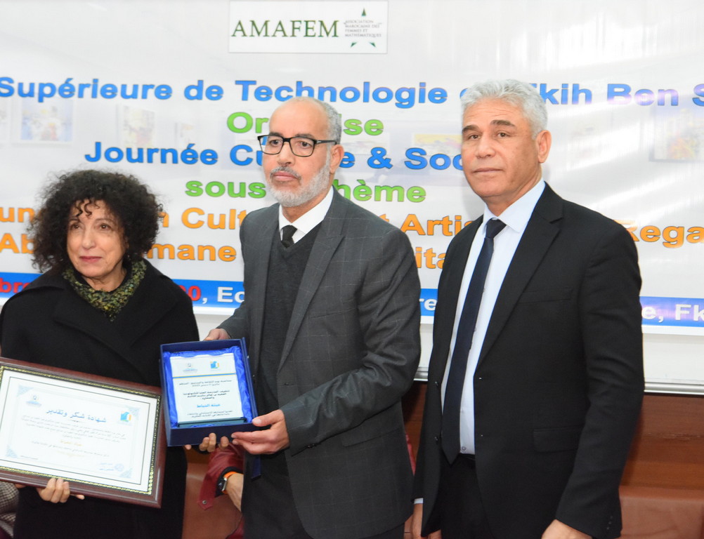 وفي ختام هذا اللقاء تم تكريم المخرج السنيمائي الكبير عبد الرحمان التازي والكاتبة المقتدرة غيثة الخياط من طرف مدير المدرسة العليا للتكنولوجيا بالفقيه بن صالح.
