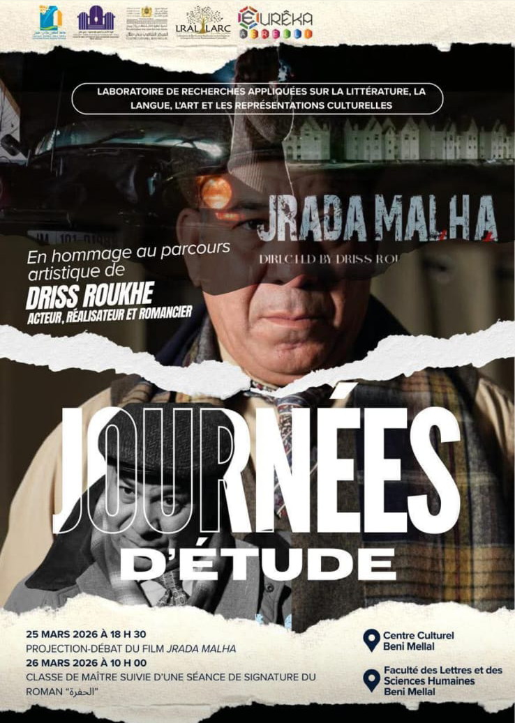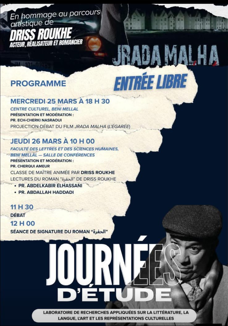 يستعد مختبر الابحاث التطبيقية في الأدب واللغة والفن والتمثلاث الثقافية بكلية الآداب والعلوم الإنسانية التابعة لجامعة السلطان مولاي سليمان ببني ملال لتنظيم أيام دراسية وثقافية مميزة، تكريما واحتفاء بالحصيلة الفنية والأدبية والسينمائية للكاتب والفنان والمخرج إدريس الروخ، وذلك يومي 25 و26 مارس الجاري.