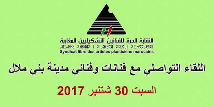 دعوة لجميع الفنانين والمثقفين و المهتمين بالشأن الفني في مدينة بني ملال و النواحي لحضور اللقاء التواصلي حول تأسيس فرع مدينة بني ملال للنقابة الحرة للفانين التشكيليين المغاربة في دار الشباب المغرب العربي بمدينة بني ملال في الساعة الرابعة مساء يوم السبت 30 شتنبر.