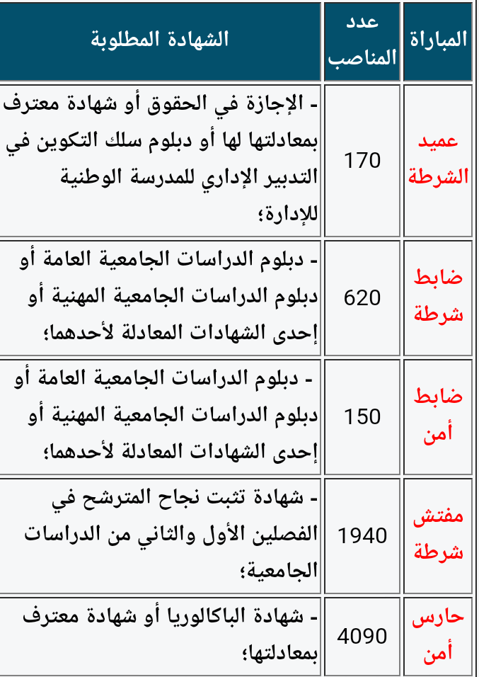 – المتوفرين على قامة لا تقل عن 1.70 متر دون انتعال أحذية بالنسبة للمترشحين الذكور لدرجات عمداء الشرطة وضباط الشرطة ومفتشي الشرطة و1.73 متر بالنسبة لدرجتي ضباط الأمن وحراس الأمن و1.67 متر بالنسبة للمترشحات من مختلف الدرجات؛